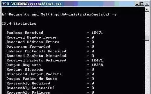 ⑤ netstat -s:-s选项能够按照各个协议分别显示其统计数据。这样就可以看到当前计算机在网络上存在哪些连接,以及数据包发送和接收的详细情况等等。如果应用程序(如Web浏览器)运行速度比较慢,或者不能显示Web页之类的数据,那么可以用本选项来查看一下所显示的信息。仔细查看统计数据的各行,找到出错的关键字,进而确定问题所在。