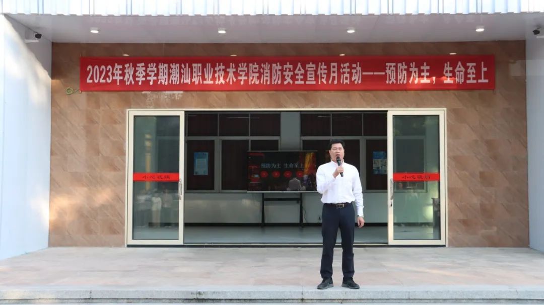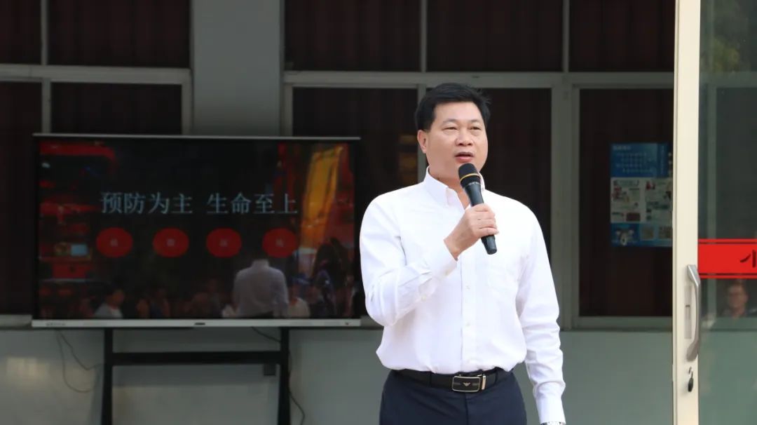 党委书记李育华作动员讲话,他强调了消防安全的重要性,要求学校要贯彻落实省教育厅下发的关于消防安全工作的文件精神,加强消防安全预防队伍建设,做好图书馆、实验室、机房、宿舍等校园重点场所的防御。