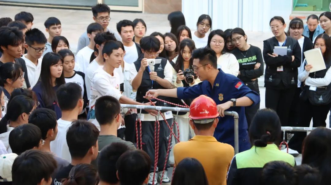 本次演练活动设置了多个应急处置场景,包括火灾现场自救逃生技能讲解、人员密集场所应急疏散、灭火器实操培训、消防结绳技巧等场景。