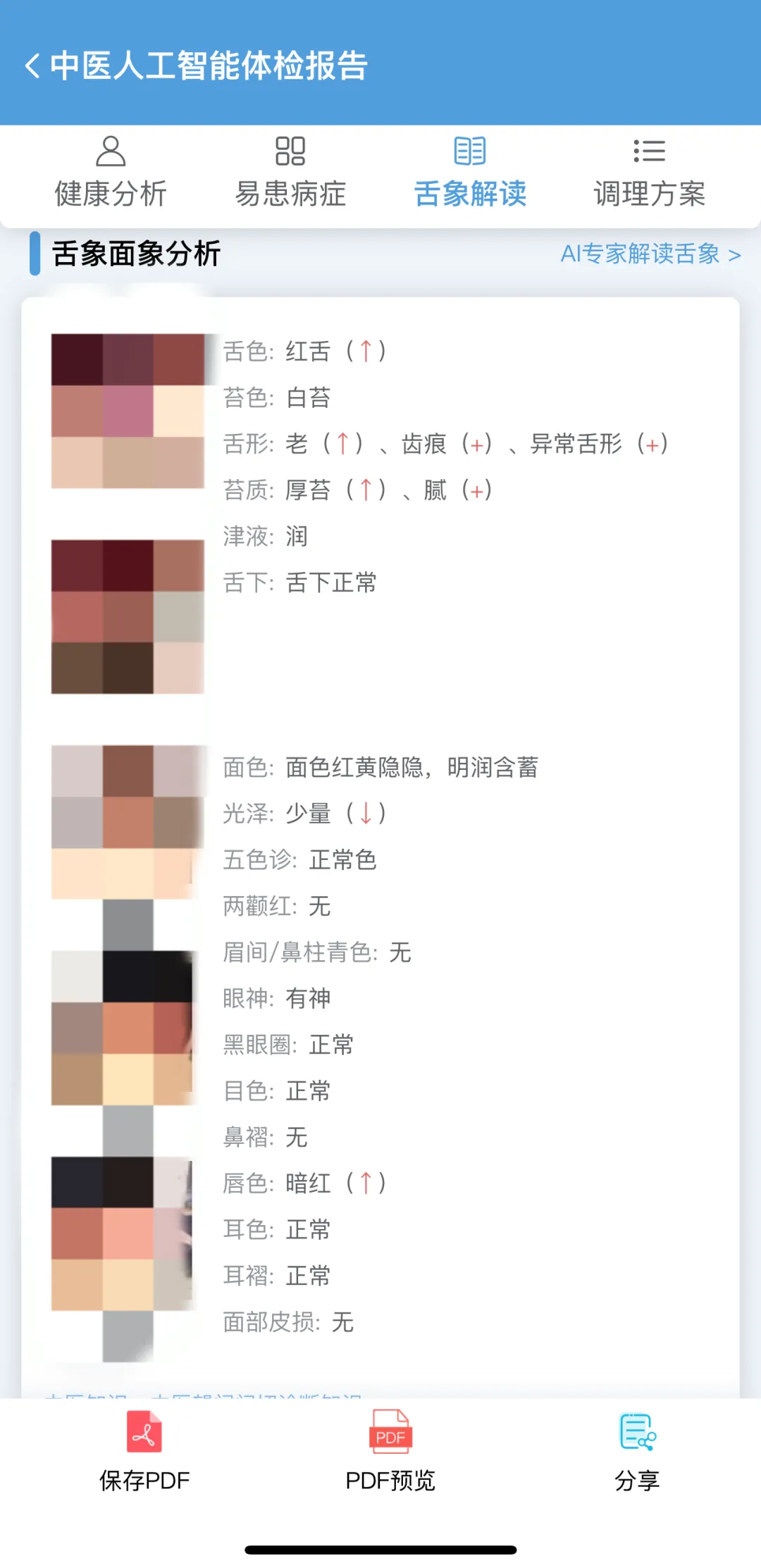 用户拍摄舌头及面部照片,平台在10秒内即可进行106种常见中医健康状态分析,根据体质状况生成个性化调理方案,指导用户精准调理、精准养生,体现“因人制宜”的中医体质理论,适用于普通民众的中医健康状态体检。
