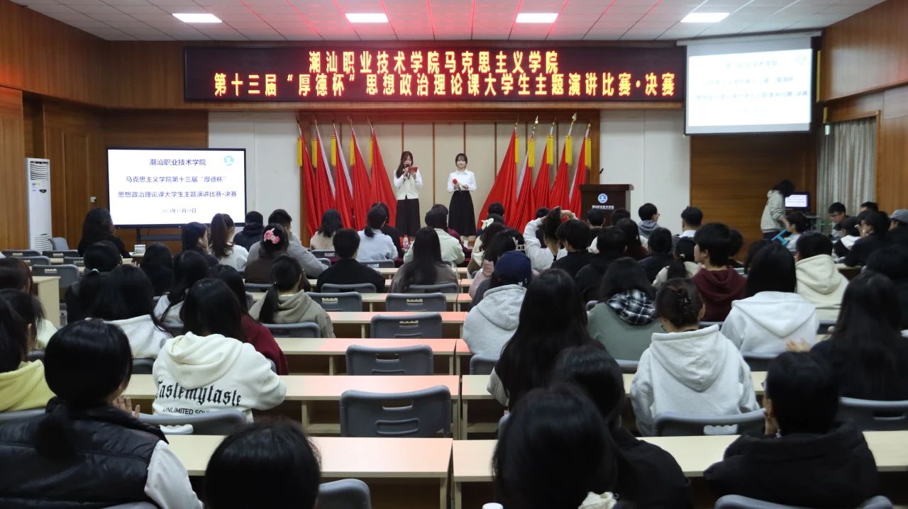 12月20日下午,作为《思想道德与法治》课程的教学实践环节,潮汕职业技术学院马克思主义学院第十三届“厚德杯”思想政治理论课大学生主题演讲比赛决赛在第二报告厅举行。