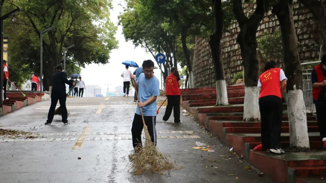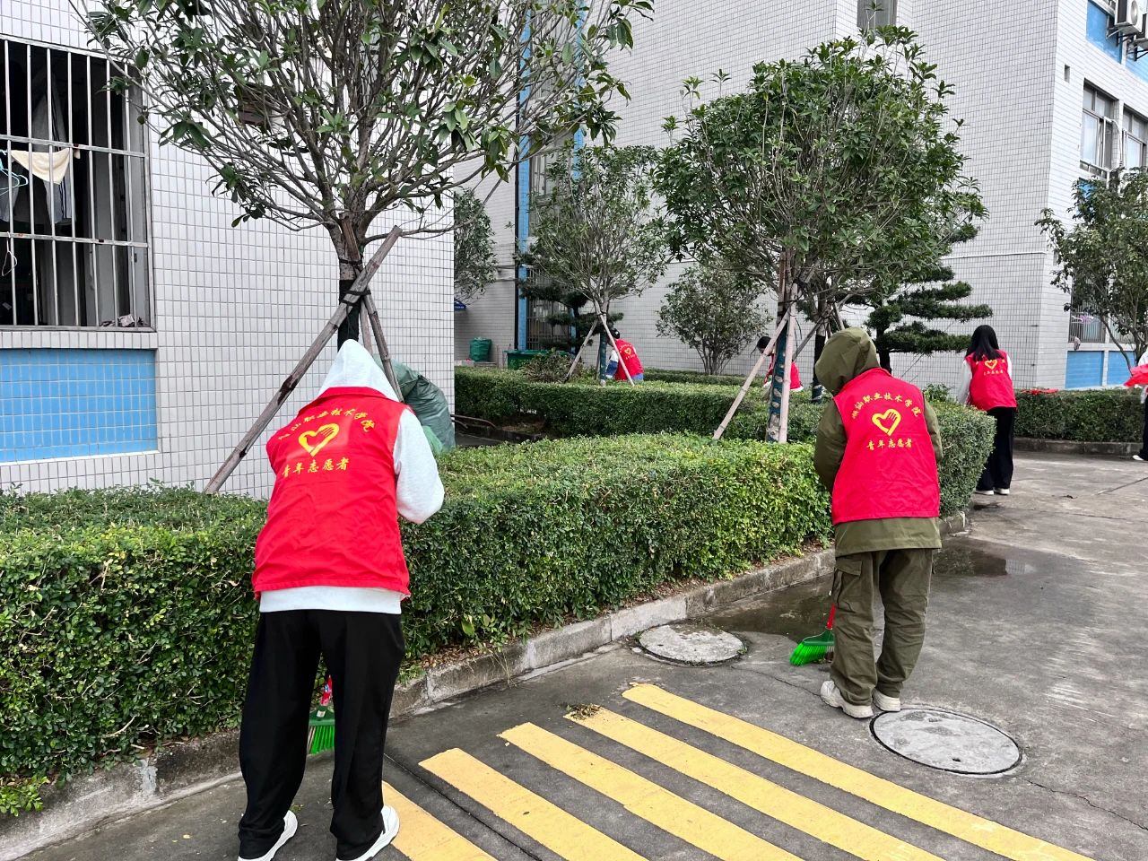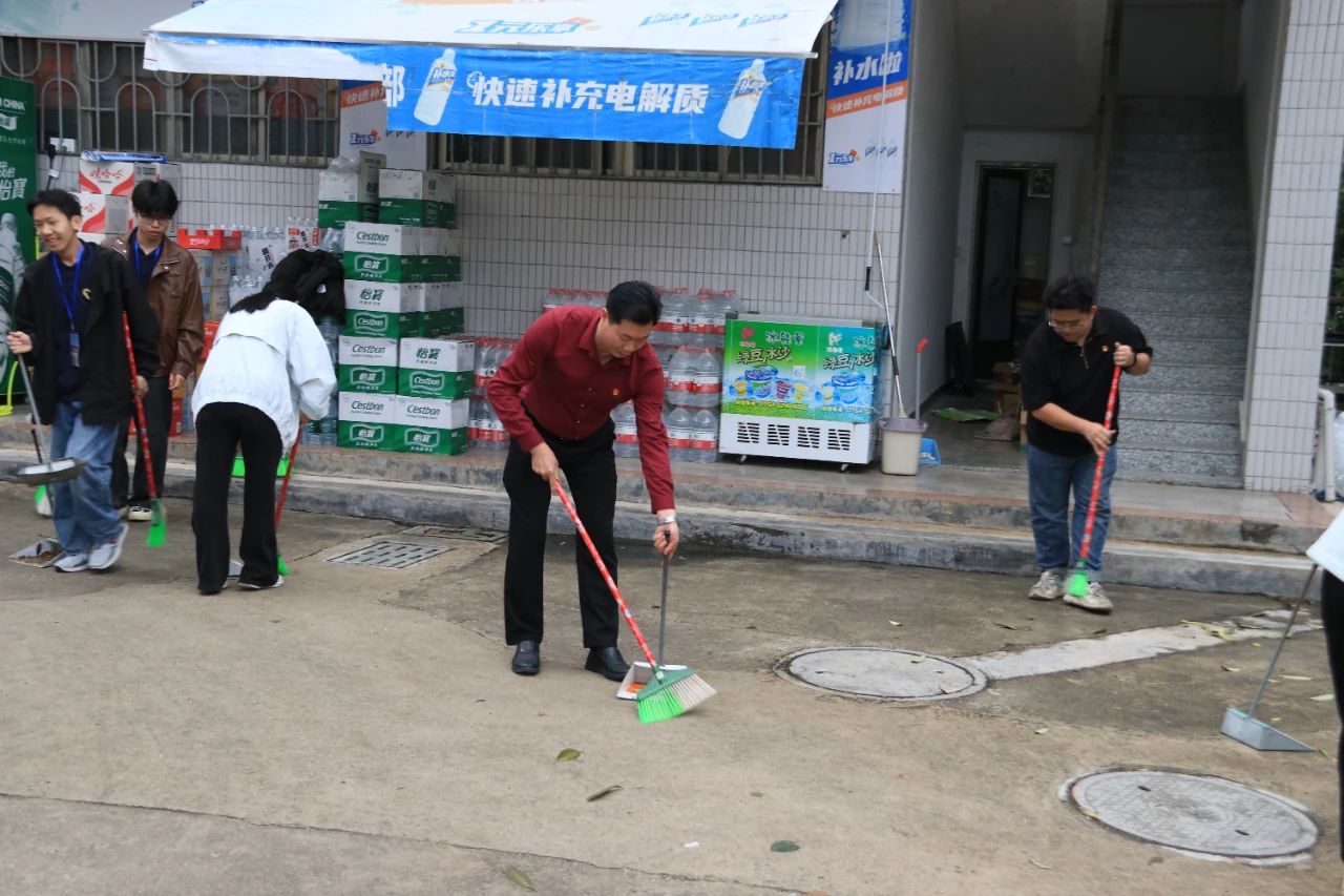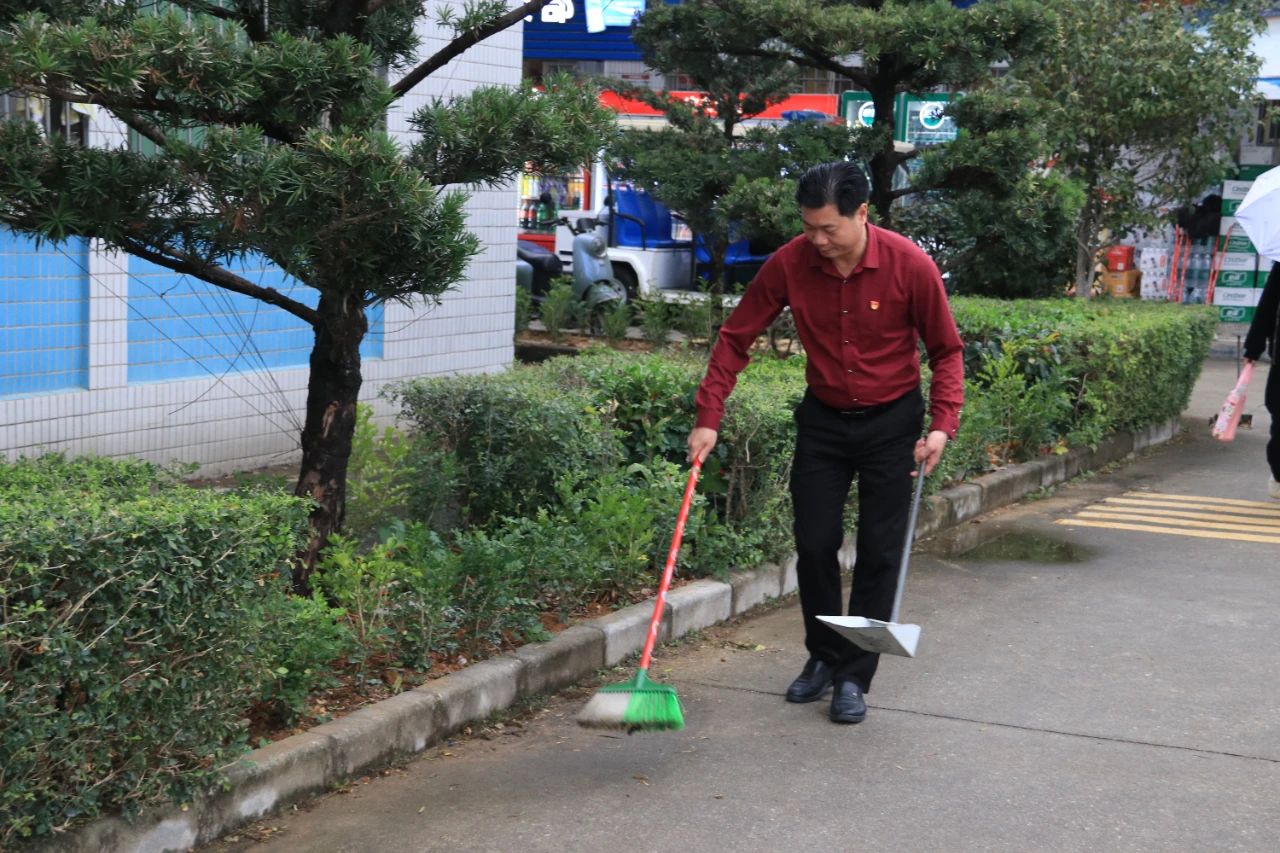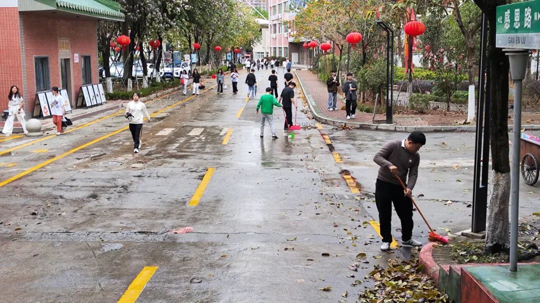 师生党员们分组行动,手持清洁工具深入潮韵广场、文化长廊、教学楼、校道、运动场、食堂、师生宿舍楼等区域,清扫路面落叶、擦拭公共设施、清理卫生死角。劳动过程中,党员师生们分工协作,干劲十足,充分展现了不怕脏、不怕累的奉献精神。经过集中清理,校园环境焕然一新,师生们的劳动成果获得来往师生的频频点赞。