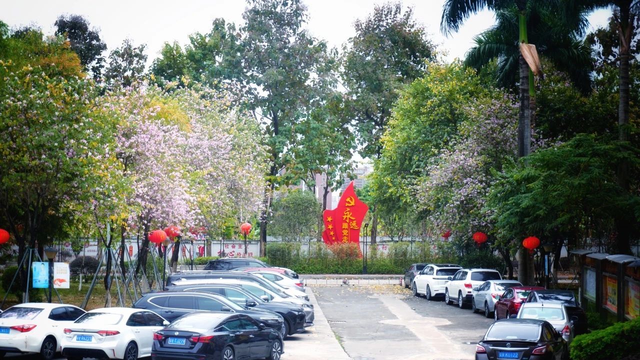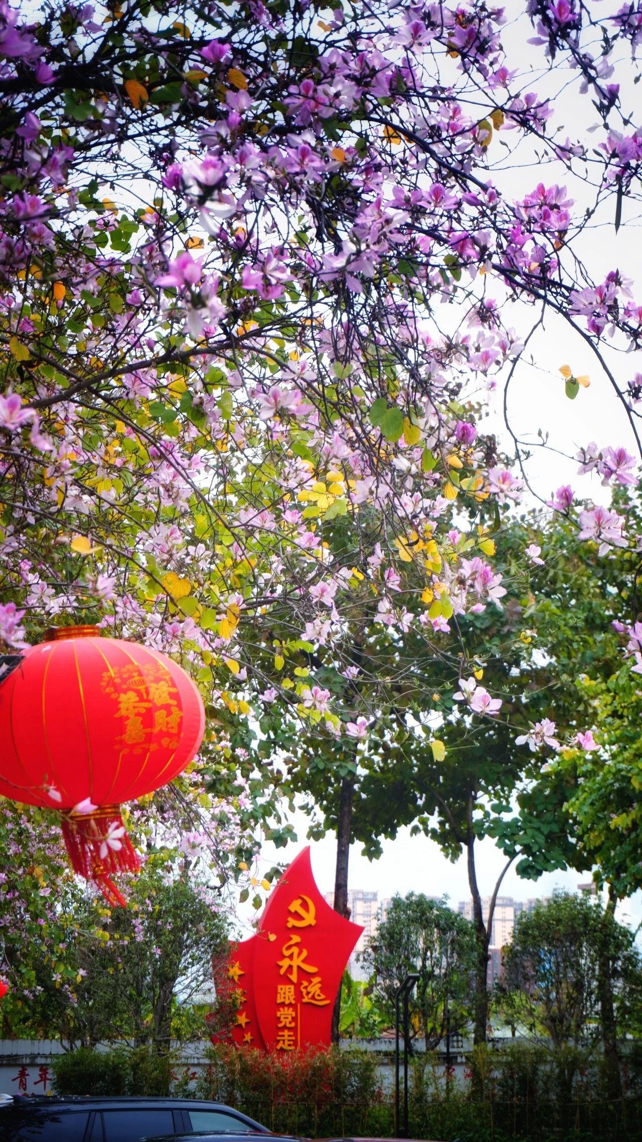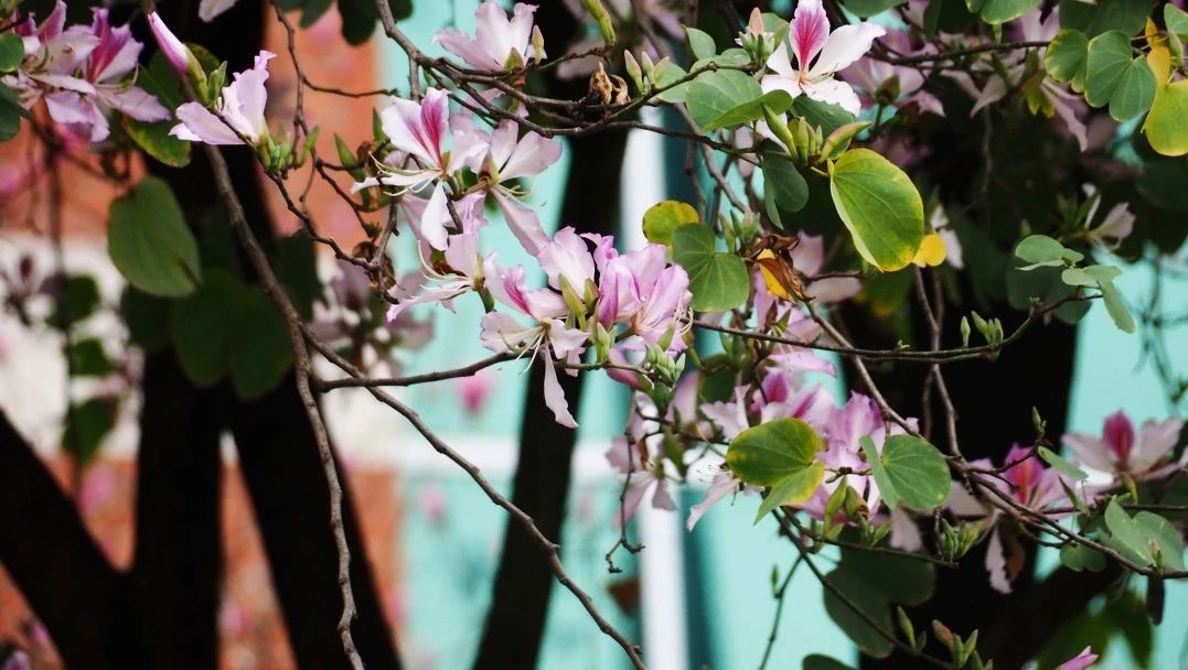 健康驿站前垂落的粉色紫荆