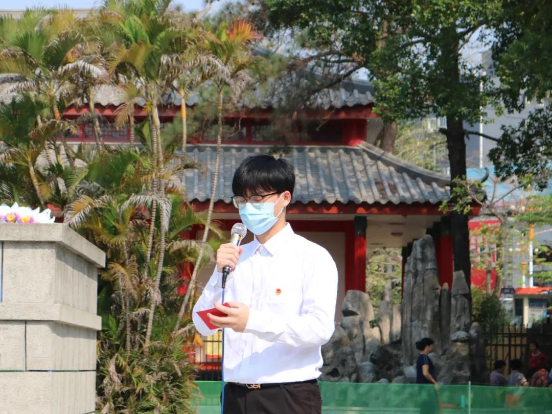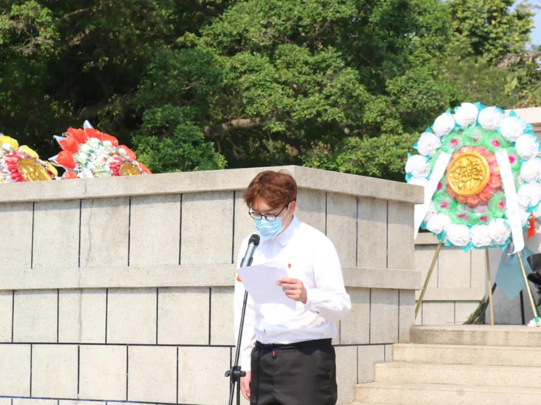 学生代表张旋号召全体同学,牢记历史,以革命先辈榜样,胸怀家国,坚定理想中,高扬奋斗的风帆,做新时代的社会主义接班人。